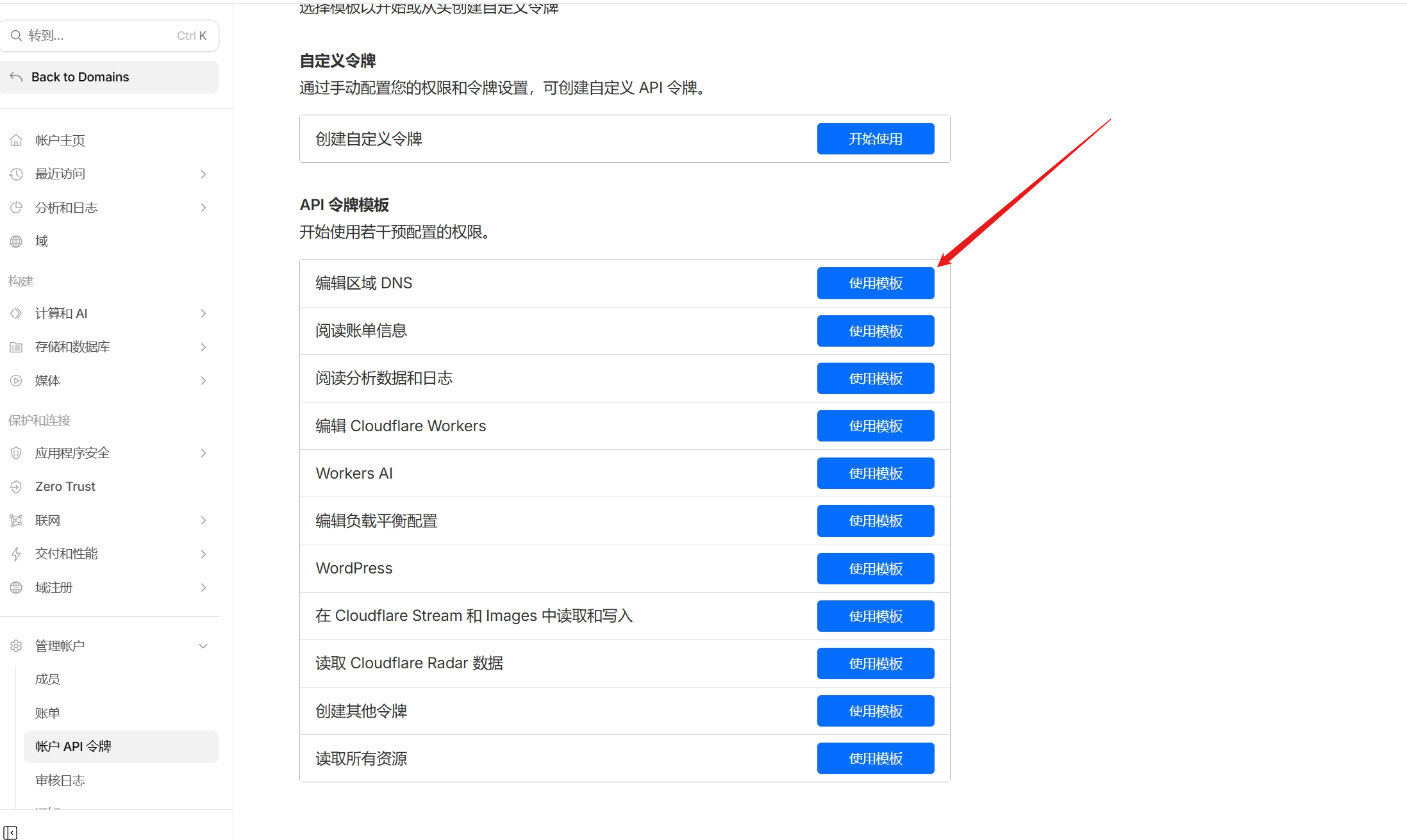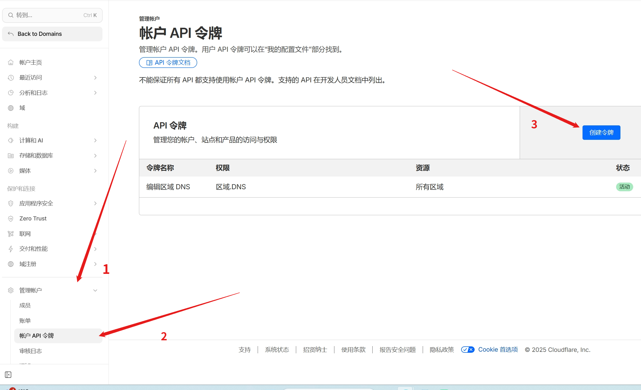 2.打开cloudflare登录你的账号,点击左下方管理账户打开账户api令牌,并创建令牌