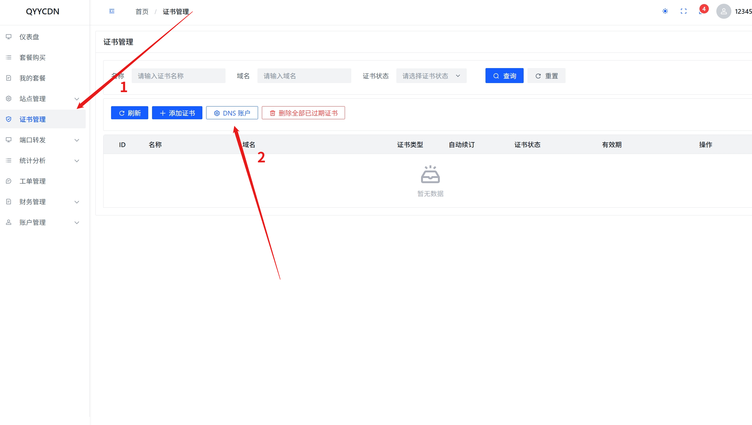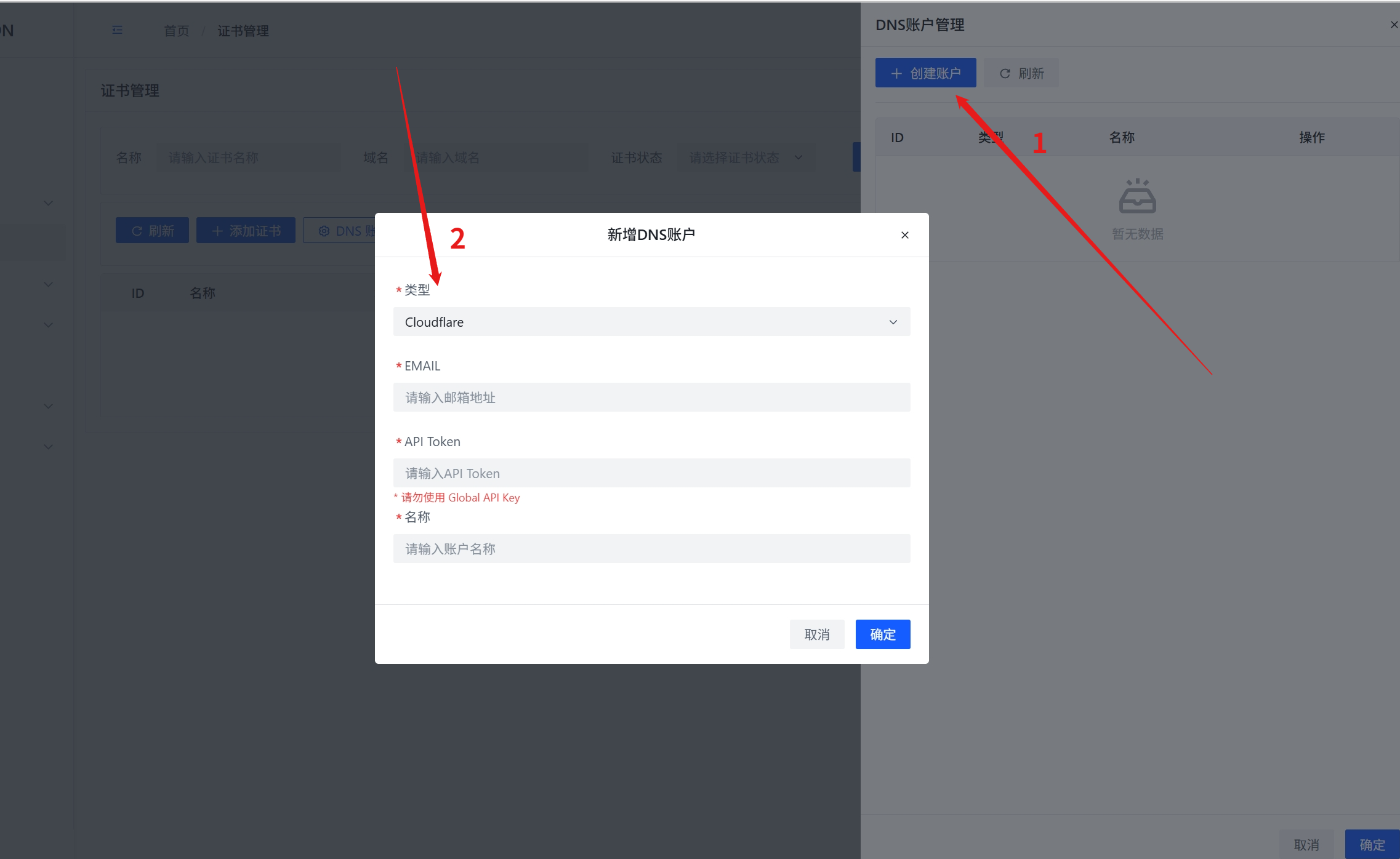 1.访问证书管理页面,点击dns账户,选择创建账户,然后选择自己的域名dns服务商类型