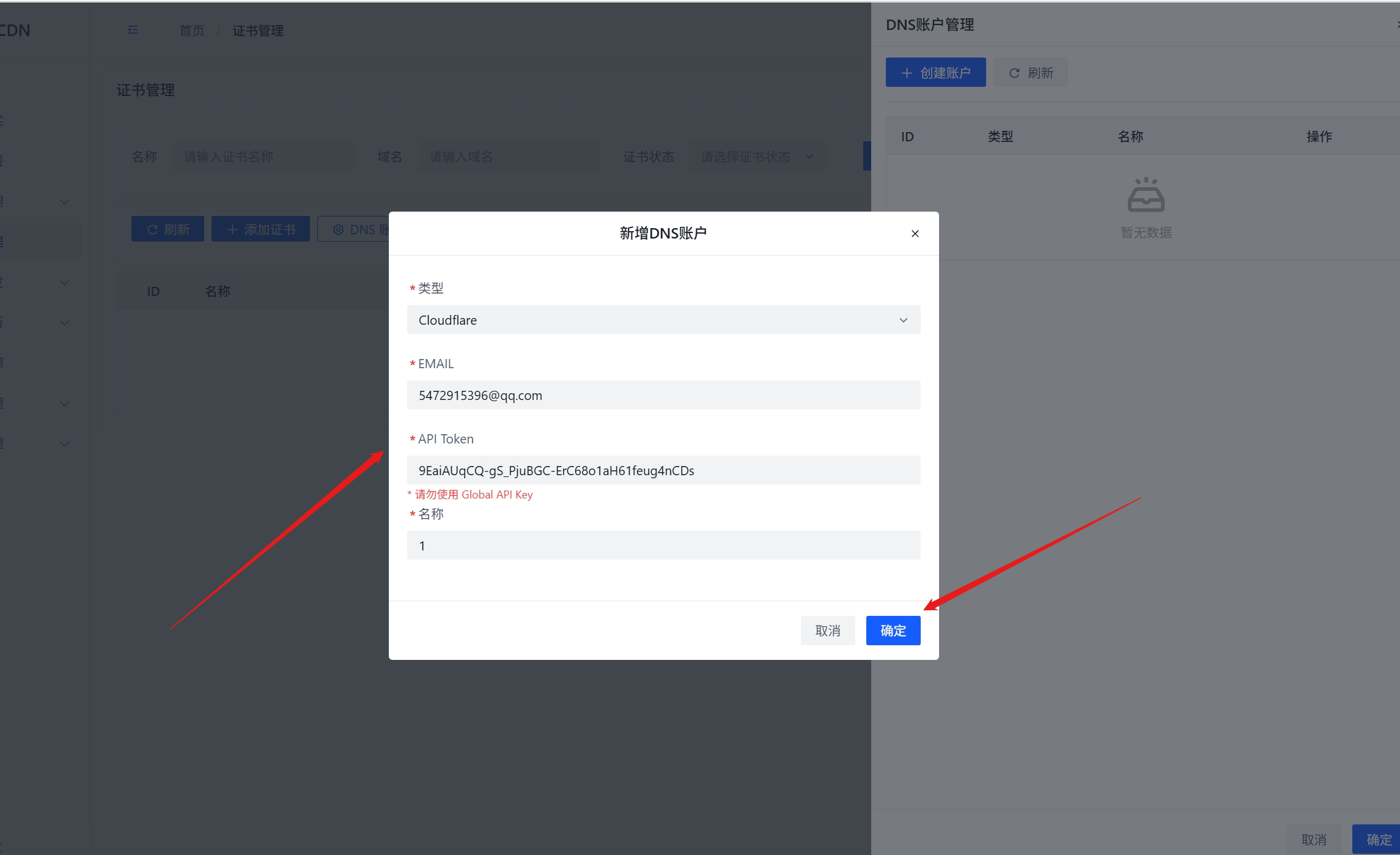 4.返回cdn控制台,并添加刚才复制的邮箱以及api令牌,并点保存