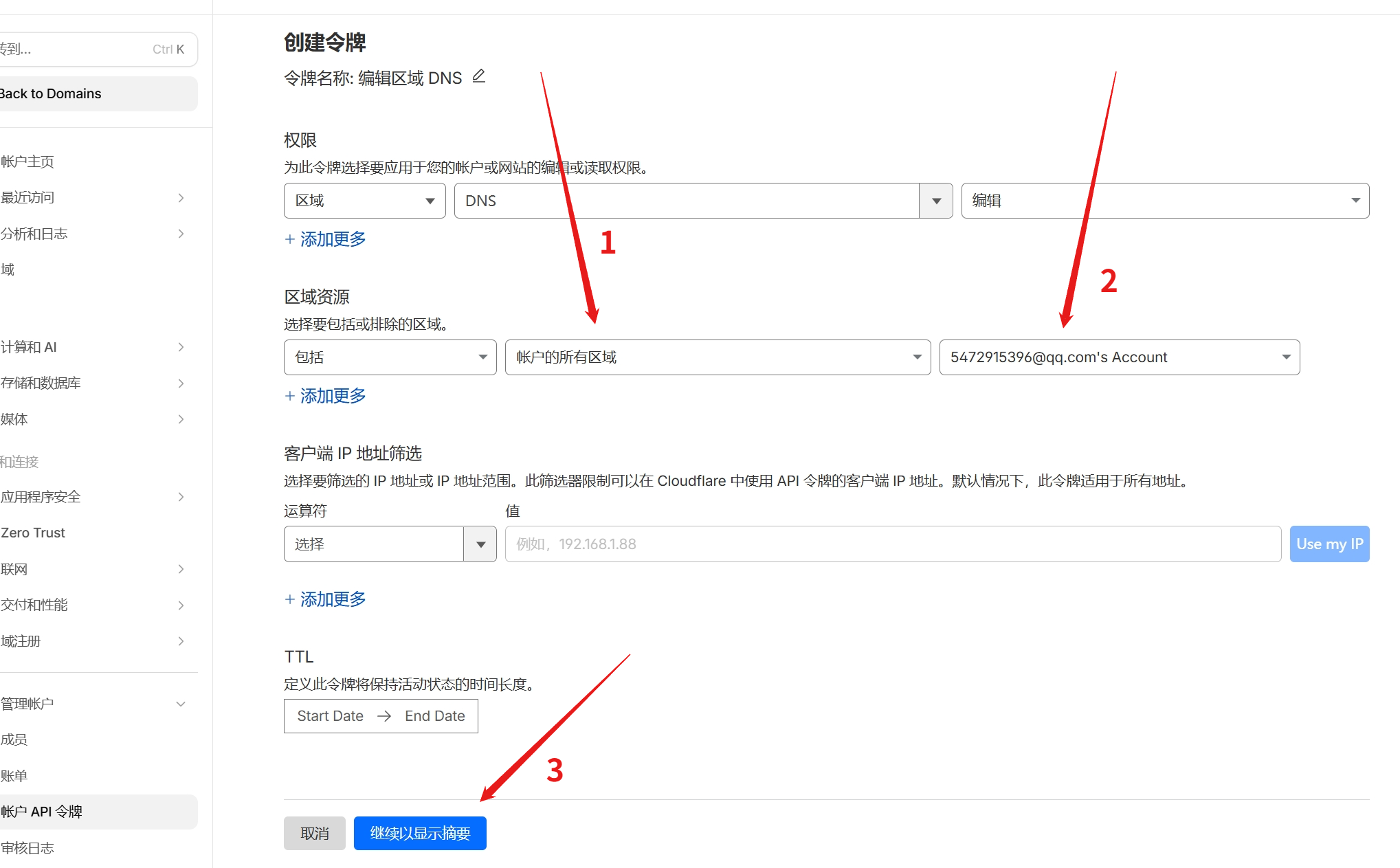 选择账户中的所有区域,并选择自己的账号,然后点击继续以显示摘要,创建令牌(复制下来)