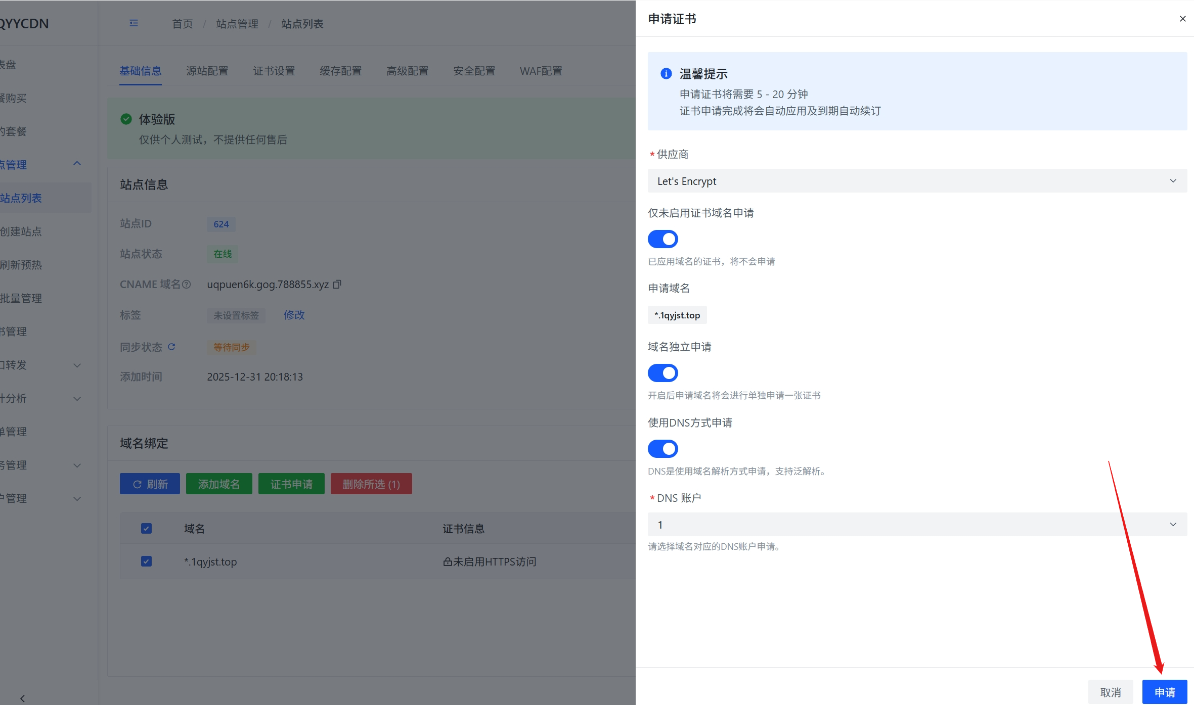 5.打开网站管理,申请证书(选择自己的泛域名),默认全开启即可,并选上dns账户,点击申请即可(申请成功自动配置)